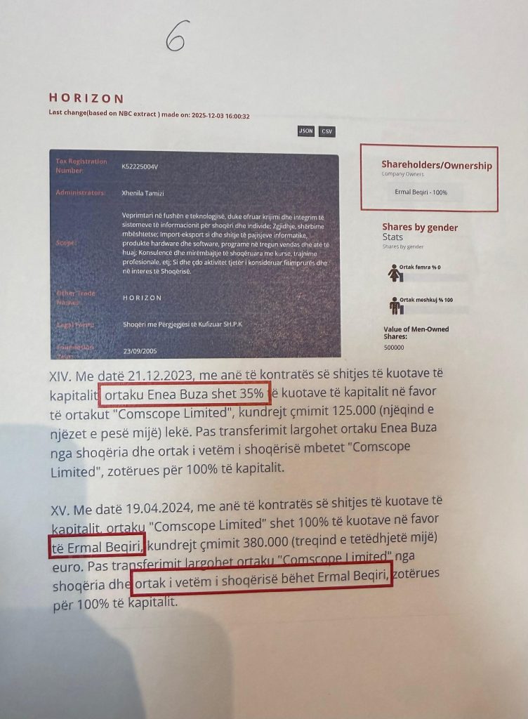 Me datën 19.4.2024, me anë të kontratës së shitjes së kuotave të kapitalit, ortaku Comscope Limited shet 100 përqind të kuotave në favor të Ermal Beqirit- Armand Frangut- kundrejt çmimit 380 mijë euro, pra një larje e mirëfillte parash në këtë rast.